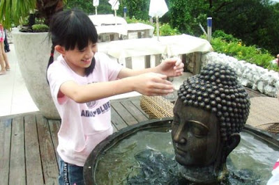 有幾個佛像的擺飾,子芹看到便說「我要來浴佛」,雙手盛水往佛的頭頂澆
